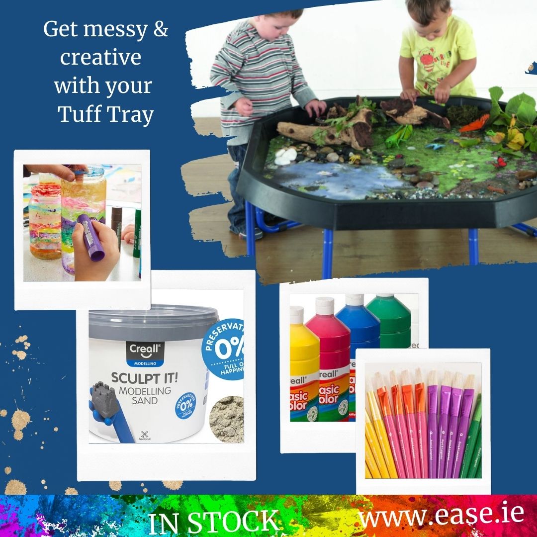 Tuff Trays are a (1 meter diameter) plastic tray that provides a contained space for children’s open ended play. It is octagonal with space for 6 children to play together. There are different quality Tuff Trays on EASE.ie; the education range or the value range. How you use it is up to your imagination. Use sensory materials to explore touch and feel or messy play materials to squash and mix or create a small world set up, like a farm, a garage or a beach.