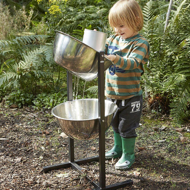 Children will love experimenting with this portable water play unit. Pour liquid into the top bowl and see it cascade into the lower section. A lovely way to add something different to sand and water play. Accessories not included. The metal bowls can be tipped as we know children love emptying and filling their water containers. Incorporate the unit into various play activities using large trays, funnels, channels, buckets, scoops, jugs etc. A lovely way to encourage investigative skills.Dimensions; if available H76 x W37 x L43cmAge range; these items are suitable for children aged age 3 years and up