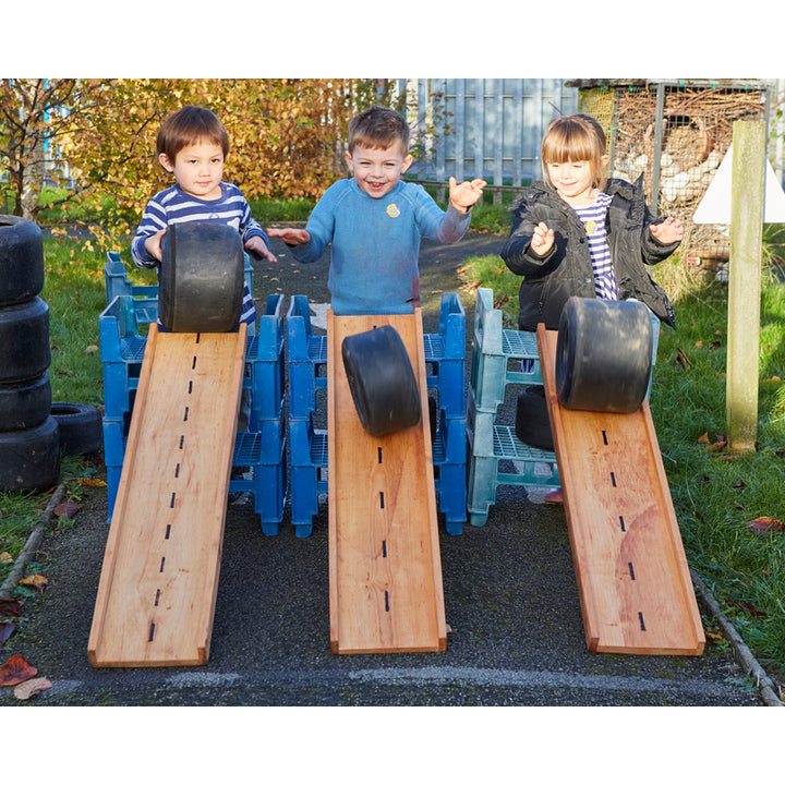 These planks are perfect for vehicle races, exploring gravity, or construction play in any outdoor setting. They can be easily stacked on crates to create ramps and their lipped edges keep small tires on track. Simple, durable, and full of adventure, these planks guarantee endless laughter without any rolling away.