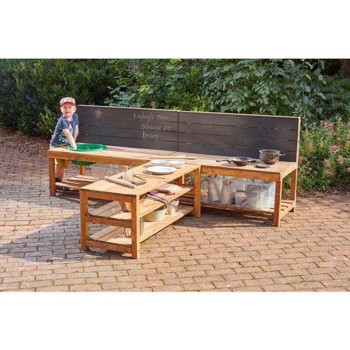 A lovely versatile piece of furniture to suit settings of all shapes and sizes. Leave in the ‘T’ shape for a superb large mud kitchen, change into a long row shape and create a role play area or swap for an ‘L’ shape for a play corner. This T work table is ideal for settings with smaller budgets due to its versatility, and will be well loved for years to come!